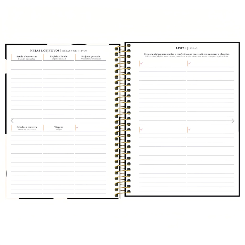 Capa dura sofisticada: com detalhes em hot stamping e fechamento em elástico, unindo elegância e praticidade.