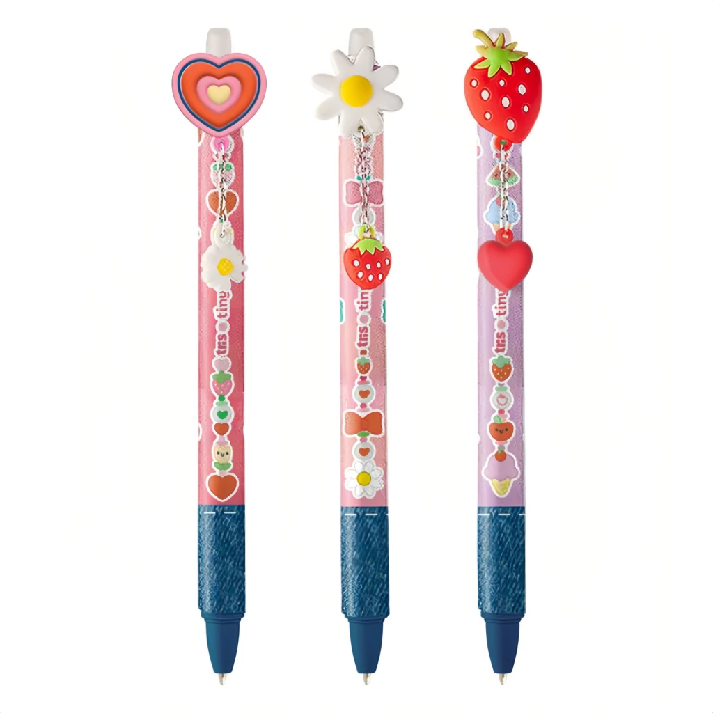 E a caneta? A caneta gel apagável Tiny é um show à parte! Além de ser linda e decorada, ela vem com toppers super fofos e um mini chaveiro que é o segredo para o mecanismo retrátil.