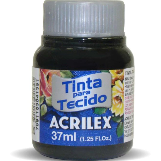 Tinta para Tecido Acrilex Fosca 37ml. Tintas à base de resina acrílica, não tóxicas e solúveis em água. Prontas para uso. São resistentes a lavagens e todas as cores são miscíveis entre si. Sua aplicação pode ser feita com pincel ou esponja, e têm fixação a frio. São tintas desenvolvidas para tecidos de fibras naturais de algodão, não devendo ser utilizadas sobre tecidos sintéticos ou engomados. Lavar o tecido antes da pintura, para retirar os resíduos de goma. Após a pintura, aguarde 72 horas para lavagem. Para diluição, use o Diluente para Tinta Tecidos, indicado para diluir, retardar a secagem, fazer Técnicas de matizados e sombreados, mantendo a resistência às lavagens. Apresentada em 123 cores Foscas.